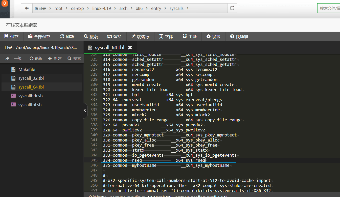 在编写模块时,我们选择一个未使用的系统调用号进行分配。比如在上图中,当前系统使用到 334 号,那么我们可以为自己的模块myhostname分配一个 335 号的系统调用号,然后在 syscall_64.tbl 里为新调用添加一条记录。